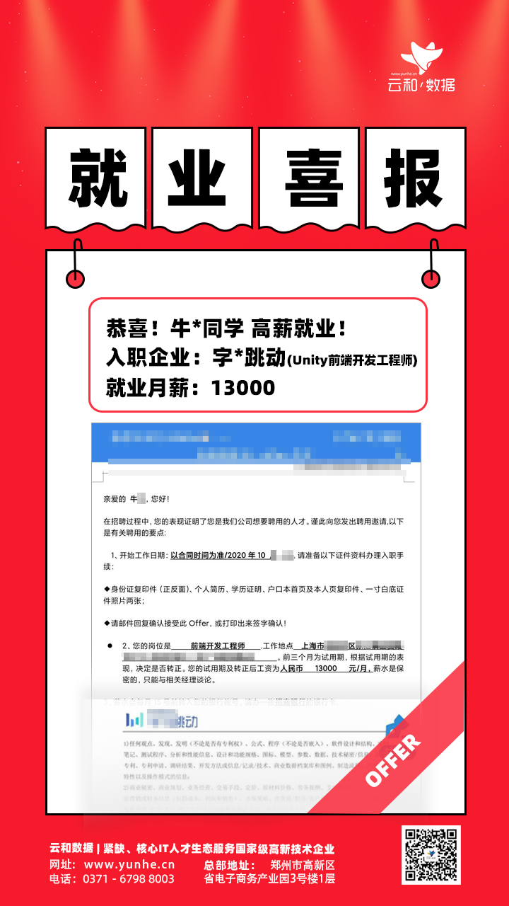 恭喜云和数据李同学入职字节跳动!月薪13K!岗位Unity前端开发工程师!
