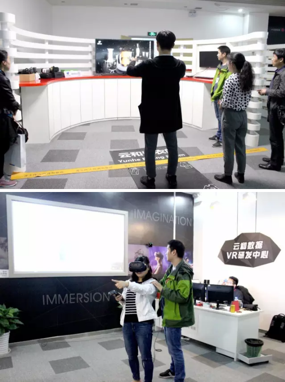 最后一个环节是在云和数据VR研发中心,老师们在工作人员的帮助下体验了虚拟试衣间和瓷器工坊项目以及VR游戏,无不对身临其境的代入感与科技感表示惊叹。